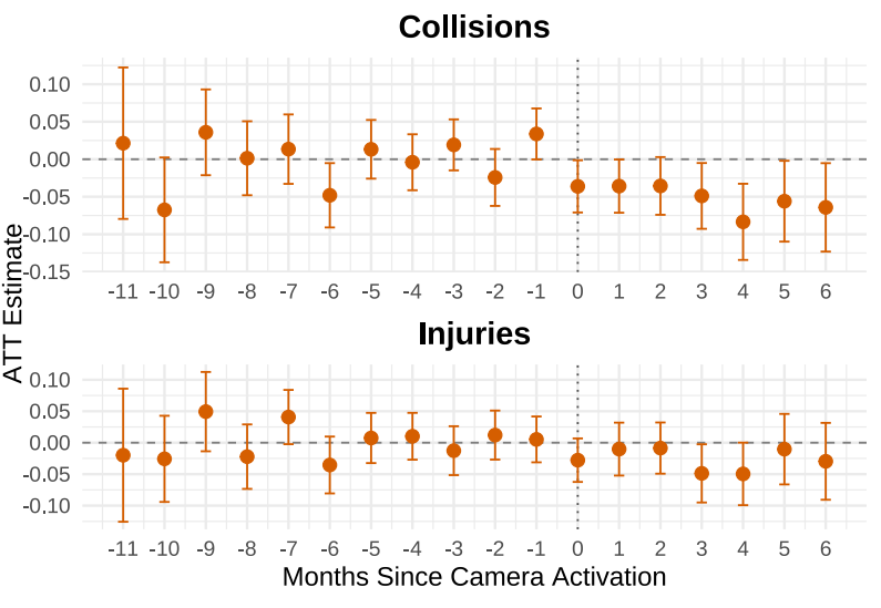 Although many studies evaluate traffic cameras, very few apply causal inference methods. Some scholars who implement stronger designs argue that they eliminate the observed safety benefits of cameras. Yet we find substantial effects using the Callaway and Sant’Anna difference-in-differences estimator.