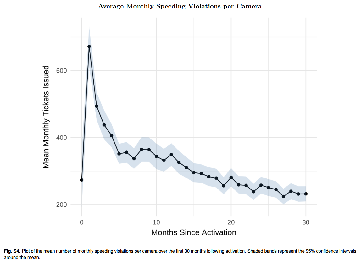 We studied NYC’s speed camera program and found that it significantly reduced collisions and injuries near intersections with cameras. We saw reductions for 7 months following camera activation. The study isn’t open access yet, you can read the accepted version here.
